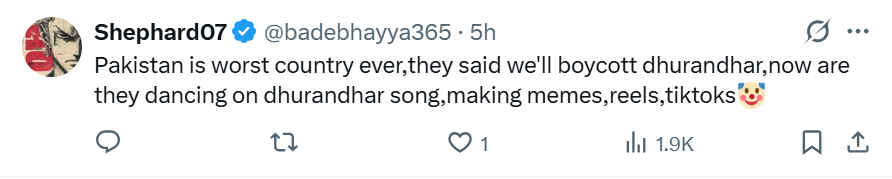 એક યુઝરે લખ્યું- 'પ્રતિબંધ હોવા છતાં ફિલ્મને લઈને આટલો ક્રેઝ છે. વાહ।' અન્ય એક યુઝરે લખ્યું- 'પાકિસ્તાન સૌથી ખરાબ દેશ છે, તેણે કહ્યું હતું કે અમે ધુરંધરનો બહિષ્કાર કરીશું, હવે તે 'ધુરંધર'ના ગીત પર નાચી રહ્યા છે, મીમ્સ, રીલ્સ, ટિક ટોક બનાવી રહ્યા છે।'