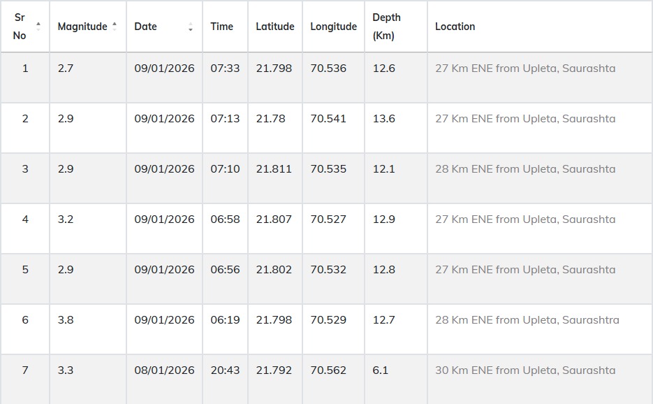 દોઢ કલાકમાં છ આંચકા નોંધાયા ગઇકાલે સાંજે 4 વાગ્યાને 43 મિનિટે પહેલો આંચકો અનુભવાયો હતો. જેનું કેન્દ્ર બિંદુ ઉપલેટાથી 30 કિલોમીટર દૂર નોંધાયું હતું. જ્યારે આજે વહેલી સવારે છ વાગ્યાથી સાડા સાત વાગ્યા સુધીમાં દોઢ કલાકમાં છ આંચકા નોંધાતા લોકોના જીવ અધ્ધ થઇ ગયા છે. આ તમામ આંચકાનું કેન્દ્ર બિંદુ ઉપલેટાથી 27થી 30 કિલોમીટરના અંતરે નોંધાયા છે. જ્યારે તીવ્રતા 3.5 થી 3.8ની હોવાનું જાણવા મળ્યું છે.