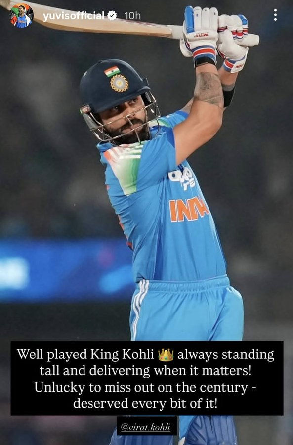 વિરાટ કોહલી 93 રન પર આઉટ થતા જ આખું સ્ટેડિયમ સ્તબ્ધ થઈ ગયું હતું. ટીમ ઈન્ડિયાના પૂર્વ સ્ટાર યુવરાજ સિંહે પણ ટીવી પર આ મેચ જોતી વખતે પોતાની લાગણી વ્યક્ત કરી હતી. યુવરાજે ઇન્સ્ટાગ્રામ સ્ટોરીમાં વિરાટનો ફોટો શેર કરતા લખ્યું: