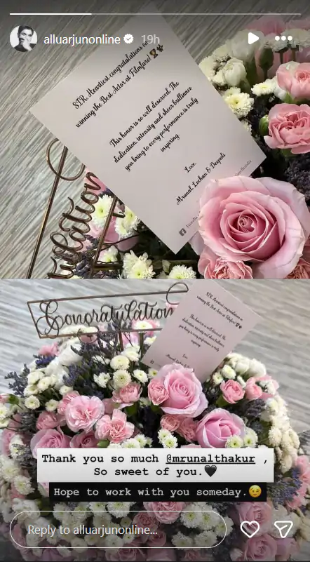 અલ્લુ અર્જુને આ બુકેની તસવીર ઇન્સ્ટાગ્રામ સ્ટોરી પર શેર કરી. તેણે જવાબમાં લખ્યું, “ખૂબ ખૂબ આભાર મૃણાલ. તમારો મેસેજ ખૂબ જ સુંદર છે. આશા છે કે કોઈ દિવસ તમારી સાથે કામ કરવાની તક મળશે.”