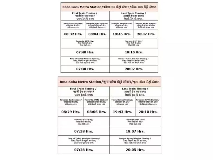 કોબા ગામ મેટ્રો સ્ટેશનથી સચિવાલય તરફ જતી પહેલી મેટ્રો ટ્રેન સવારે 8.32 કલાકે જશે. આ સાથે કોબા ગામ મેટ્રોથી એપીએમસી સ્ટેશન તરફ જતી 8.04 કલાકે જશે. કોબાથી ગિફ્ટ સિટી તરફ 7.40 કલાકે જશે. ટિકિટ બારી સવારે 7.40 કલાકે શરૂ થશે.