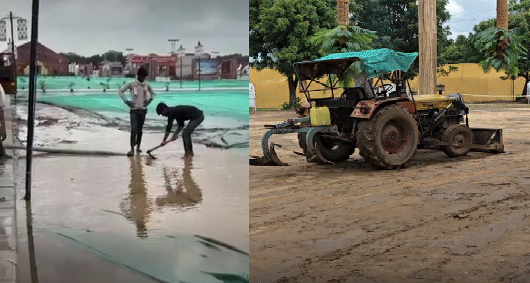 સરદાર પટેલ રિંગરોડ પર ઓગણજ સર્કલથી ભાડજ સર્કલ તરફ જવાના રોડ ઉપર આવેલા અને યુવાનોમાં સૌથી પ્રખ્યાત એવા મંડપમ ગરબા ગ્રાઉન્ડમાં વરસાદને કારણે પાણી ભરાઈ ગયાં હતાં. ગરબા આયોજક દ્વારા વહેલી સવારથી જ કાદવ-કીચડ દૂર કરવાની કામગીરી કરવામાં આવી રહી છે, જેમાં નાનાં જેસીબી અને ટ્રેક્ટર તેમજ મજૂરોની મદદથી હાલમાં ગ્રાઉન્ડને સરખું કરવાની કામગીરી કરવામાં આવી રહી છે. કેટલીક જગ્યાએ ગ્રાઉન્ડમાં કાદવ-કીચડ છે, જેથી આજે મોડીસાંજ સુધીમાં સાફ-સફાઈ કરીને ખેલૈયાઓ ફરીથી ગરબાની મોજ માણી શકે એ પ્રકારની તૈયારીઓ કરવામાં આવી રહી છે.