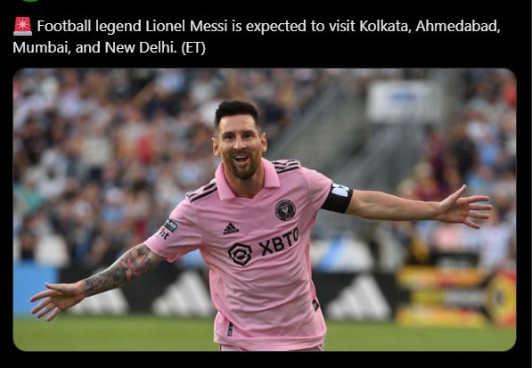 વિશ્વપ્રસિદ્ધ ફૂટબોલર લિયોનેલ મેસ્સી આ વર્ષની અંતિમ મહિનામાં ભારતની મુલાકાત લેશે, અને તેમણે પોતાની આ મુલાકાતની આધિકારિક પુષ્ટિ પણ આપી છે. મેસ્સી છેલ્લે 2011માં ભારત આવ્યા હતા, અને લગભગ 14 વર્ષ બાદ ફરી એકવાર ભારત આવવાનો અવસર મળશે. મેસ્સીએ ભારત યાત્રા અંગે પોતાની ભાવનાઓ વ્યક્ત કરતા કહ્યું હતું કે: ભારત જેવા ફૂટબોલ-પ્રેમી દેશમાં પાછા ફરવું મારા માટે ખૂબ જ ગૌરવની વાત છે. તેમનું કહેવું છે કે ભારત મારા માટે એક ખાસ સ્થાન ધરાવતો દેશ છે.