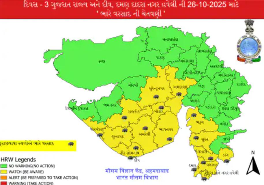 26 ઓક્ટોબરે મોરબી, સુરેન્દ્રનગર, જામનગર, દેવભૂમિ દ્વારકા, પોરબંદર, જૂનાગઢ, રાજકોટ, ગીર સોમનાથ, દીવ, અમરેલી, ભાવનગર, બોટાદ, વડોદરા, છોટાઉદેપુર, ભરૂચ, નર્મદા, સુરત, તાપી, નવસારી, ડાંગ, વલસાડ, દમણ અને દાદરા નગર હવેલીમાં હળવાથી મધ્યમ વરસાદની આગાહી કરવામાં આવી છે. જ્યારે અમદાવાદ, આણંદ, ખેડા, પંચમહાલ, મહીસાગર, દાહોદ અને કચ્છમાં છૂટાછવાયાં સ્થળોએ હળવાથી મધ્યમ વરસાદની આગાહી કરવામાં આવી છે.