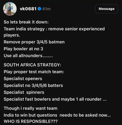 તેમણે લખ્યું, "ટીમ ઈન્ડિયાની રણનીતિ- સિનિયર ખેલાડીઓને હટાવો, 3/4/5 નંબરના અસલી બેટર્સને હટાવો, નંબર-3 પર બોલરને રમાડો, ટીમમાં માત્ર ઓલરાઉન્ડર્સ જ ભરો... સાઉથ આફ્રિકાની રણનીતિ- સ્પેશિયાલિસ્ટ ઓપનર, સ્પેશિયાલિસ્ટ મિડલ ઑર્ડર, સ્પેશિયાલિસ્ટ સ્પિનર, સ્પેશિયાલિસ્ટ ફાસ્ટ બોલર... અને માત્ર એક ઓલરાઉન્ડર.