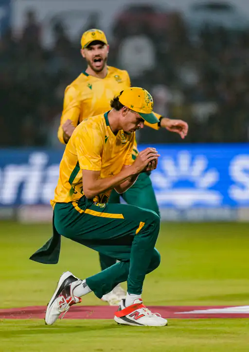 અર્શદીપ સિંહે ત્રીજી ઓવરમાં પોતાની બીજી વિકેટ લીધી. તેણે ટ્રિસ્ટન સ્ટબ્સને વિકેટકીપર જીતેશ શર્માના હાથે કેચ કરાવ્યો. પહેલા અમ્પાયરે સ્ટબ્સને નોટ આઉટ આપ્યો હતો, પરંતુ કેપ્ટન સૂર્યકુમાર યાદવે તરત જ રિવ્યુ લીધો. રિપ્લેમાં સ્પષ્ટ દેખાયું કે બોલ બેટને અડ્યો હતો, ત્યારબાદ અમ્પાયરે નિર્ણય બદલ્યો. સ્ટબ્સ 14 રન બનાવીને આઉટ થયો.